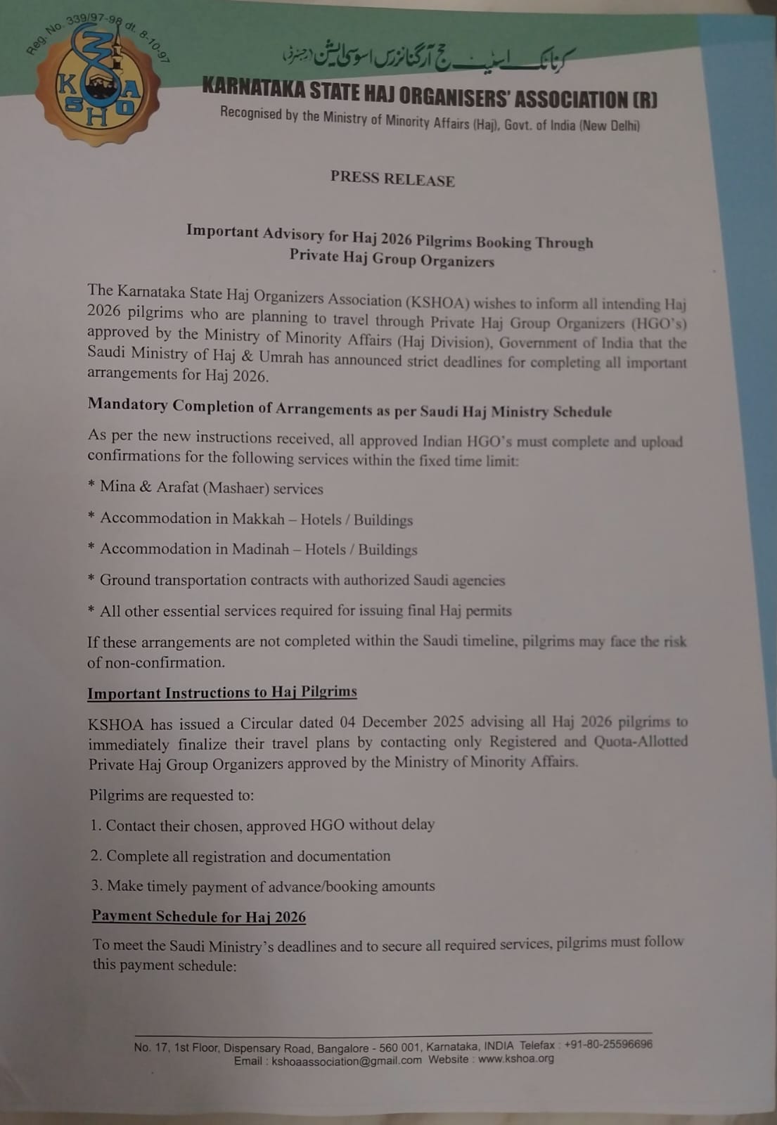 Bengaluru | The Karnataka State Haj Organizers Association (KSHOA) has issued an important advisory for all Haj 2026 pilgrims who are planning to travel through Private Haj Group Organizers (HGO’s) approved by the Ministry of Minority Affairs, Government of India.