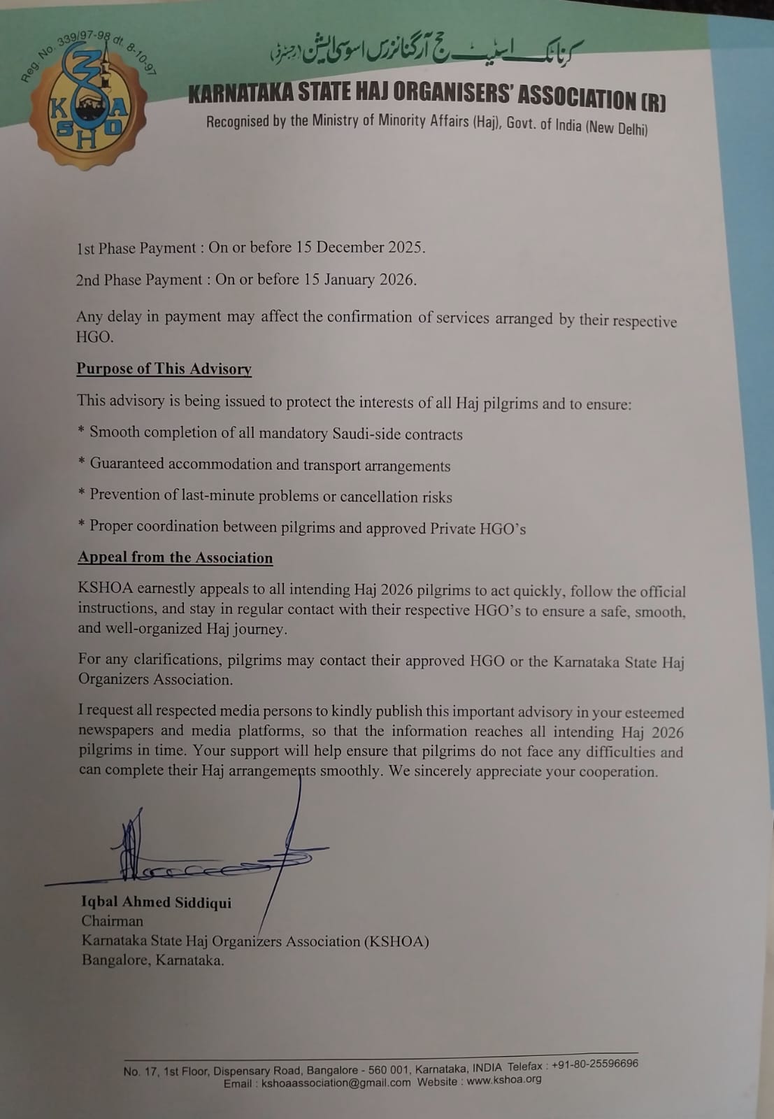 KSHOA Chairman Mr. Iqbal Ahmed Siddiqui has appealed to all intending Haj 2026 pilgrims to act quickly, follow official instructions and stay in continuous contact with their respective HGO’s to ensure a safe and well-organized Haj journey.